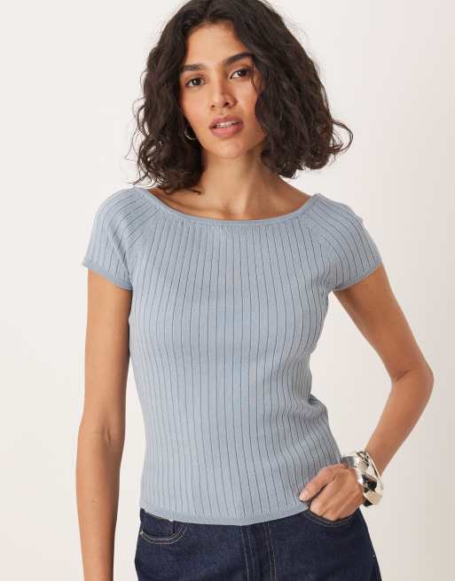 AWARE - Top blu polvere in maglia a coste con maniche ad aletta e spalle scoperte