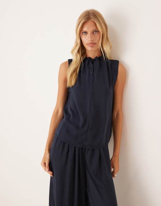 AWARE - Top senza maniche accollato blu navy a pieghe in coordinato