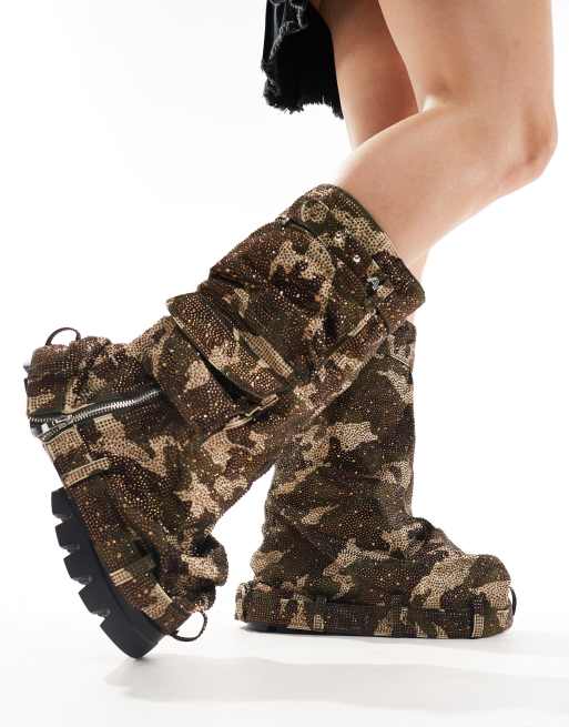 Azalea Wang - Angela1 - Stivali al ginocchio ricoperti mimetici con strass e suola spessa