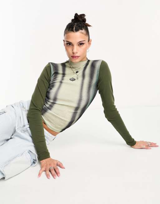 Basic Pleasure Mode - Top in rete a maniche lunghe verde con righe sfocate