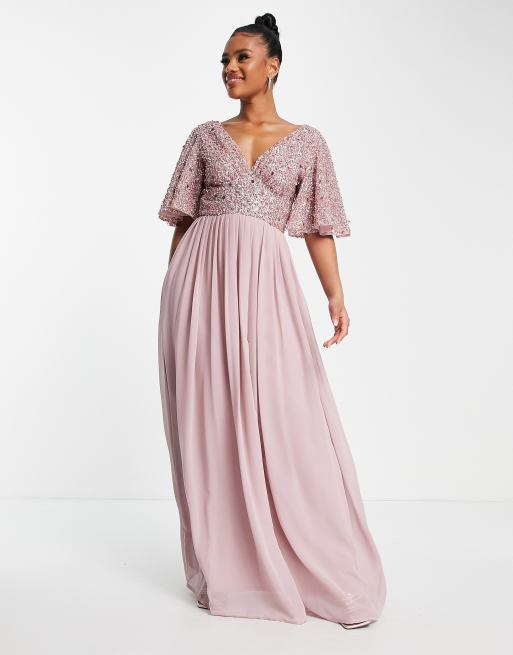Beauut - Vestito da damigella lungo con corpetto decorato e maniche con volant rosa ghiaccio