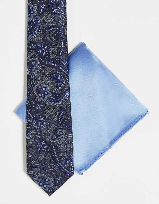 Ben Sherman - Cravatta blu con stampa cachemire e fazzoletto da taschino blu a tinta unita