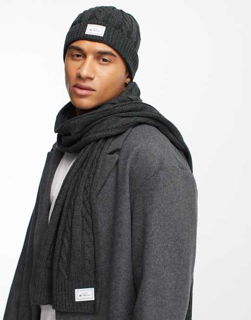 Ben Sherman - Set con berretto e sciarpa in maglia a trecce grigio