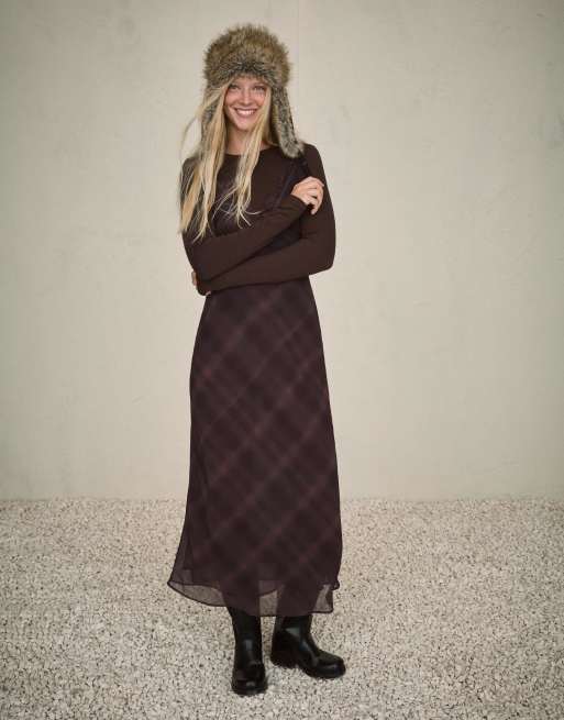 Bershka - Blonde - Vestito midi marrone in pizzo e chiffon