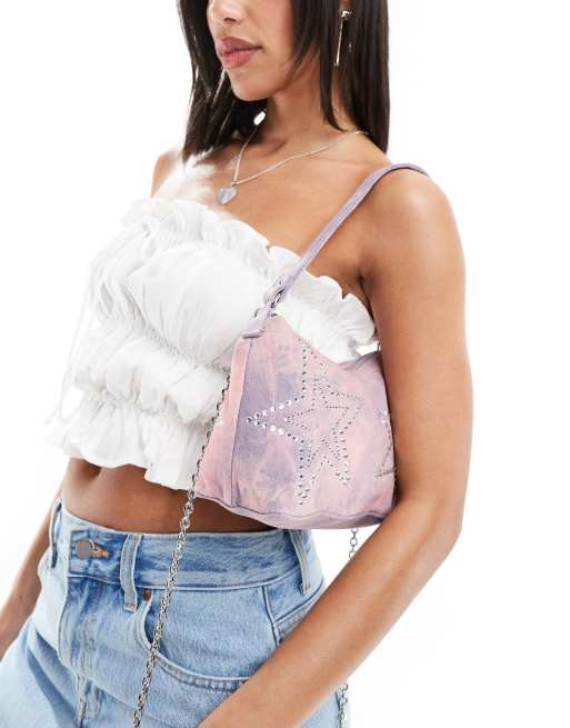 Bershka - Borsa da spalla in denim viola slavato con borchie a stella