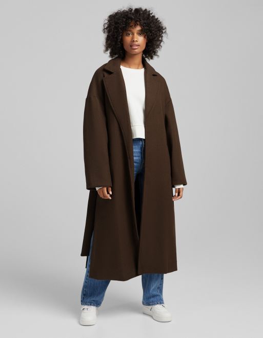 Bershka - Cappotto lungo marrone cioccolato con cintura