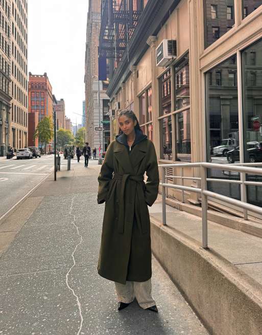 Bershka - Cappotto oversize in misto lana con cintura kaki
