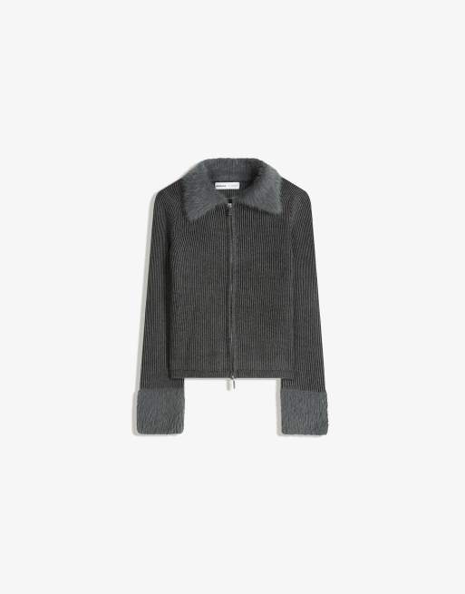 Bershka - Cardigan grigio con chiusura zip e colletto in pelliccia sintetica