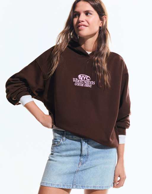 Bershka - Felpa con cappuccio marrone stampata