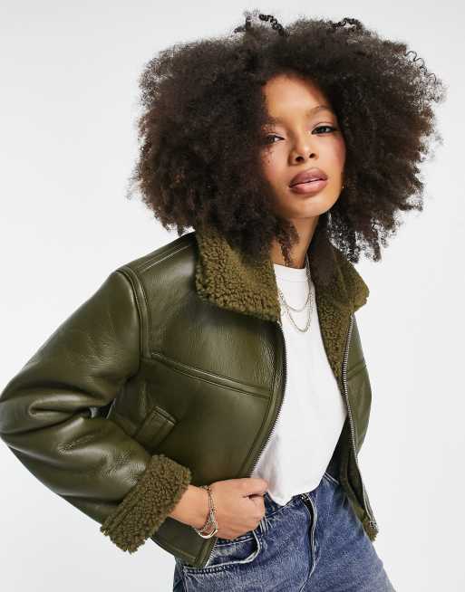 Bershka - Giacca corta kaki con finiture in montone