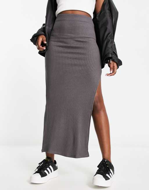 Bershka - Gonna al polpaccio fasciante grigia a coste con bordo smerlato