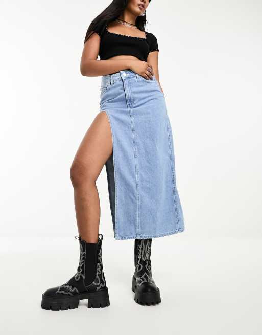 Bershka - Gonna midi di jeans lavaggio chiaro con spacco laterale