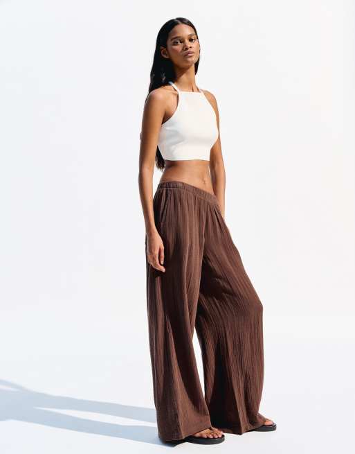 Bershka - Pantaloni a gamba larga marroni in tessuto doppio rustico