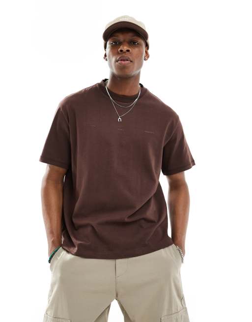 Bershka - T-shirt squadrata marrone scuro con stampa tono su tono