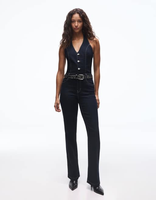 Bershka - Tuta jumpsuit lunga di jeans blu