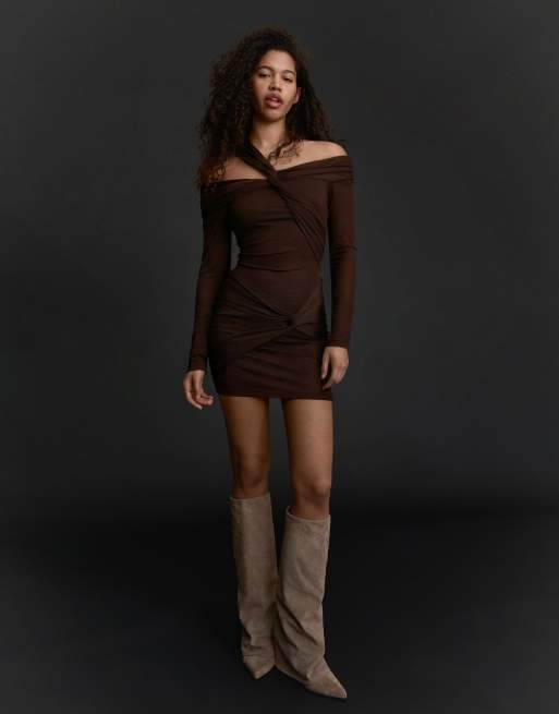Bershka - Vestito corto a maniche lunghe in tulle marrone con nodi