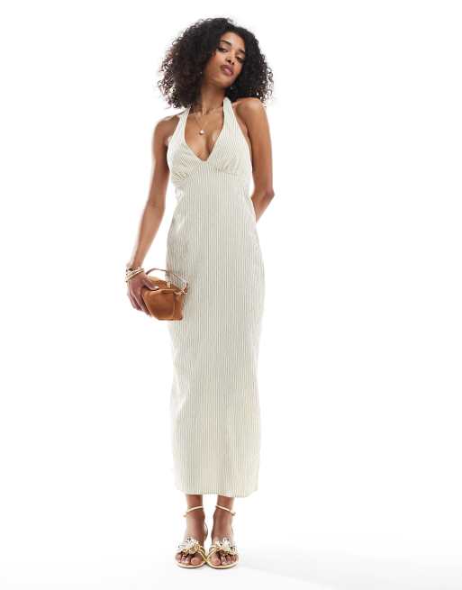Bershka - Vestito lungo in lino écru a righe allacciato al collo