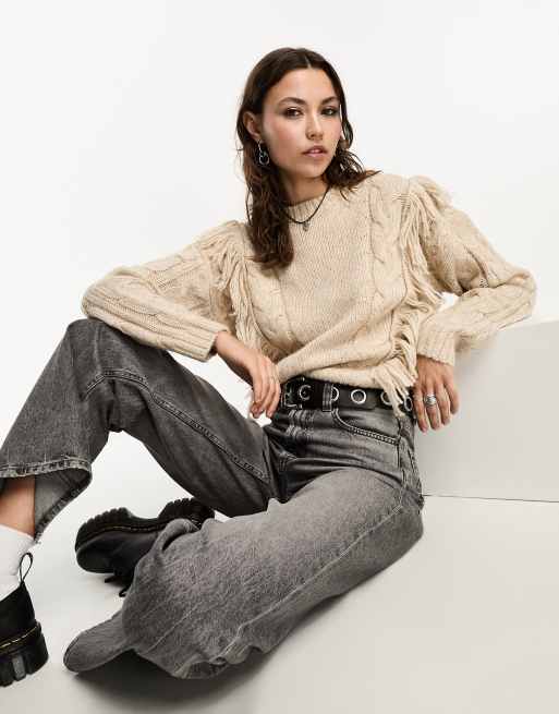 Brave Soul - Maglione lavorato a trecce écru con nappe