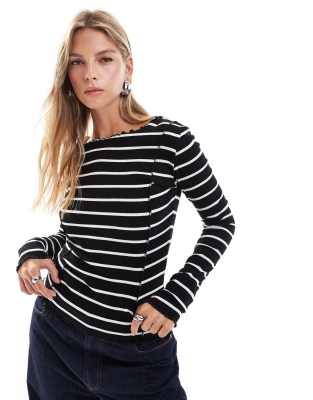 Brave Soul - Top a maniche lunghe nero e bianco a righe con fondo smerlato