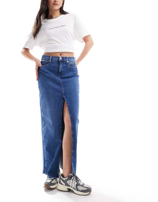 Calvin Klein Jeans - Gonna midi in denim lavaggio medio con spacco sul davanti