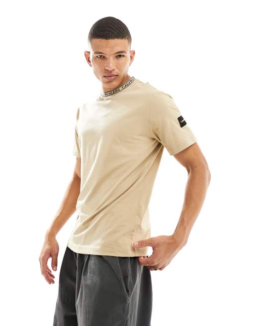 Calvin Klein - T-shirt beige con fettuccia del logo sul colletto ed etichetta laterale