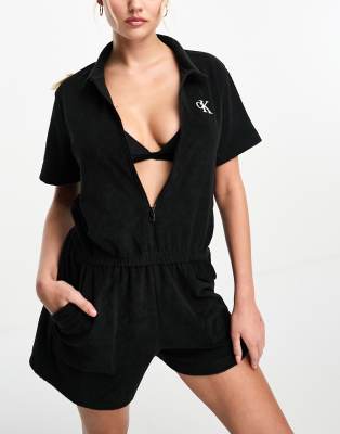 Calvin Klein - Tuta corta nera da spiaggia con zip sul davanti e monogramma