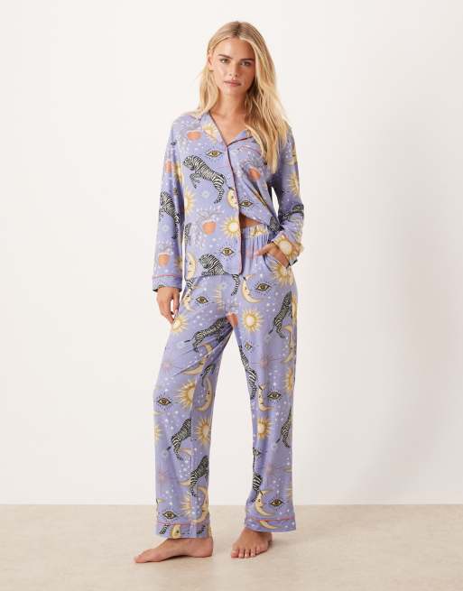 Esclusiva Chelsea Peers Petite - Pigiama con maglia a maniche lunghe e pantaloni lilla con stampa celestiale