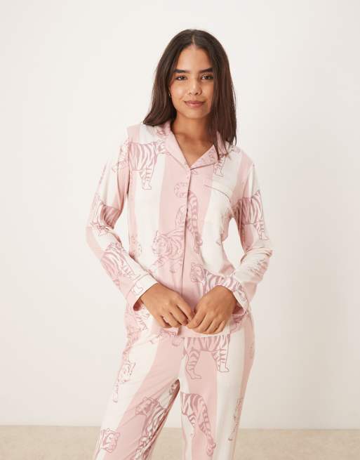 Chelsea Peers - Pigiama con stampa di leopardi a righe in poliestere con top a maniche lunghe con rever
