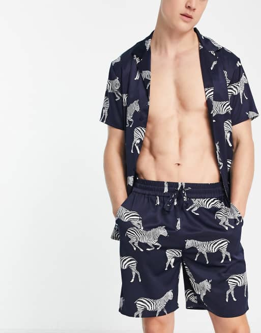 Chelsea Peers - Pigiama corto in raso blu navy con stampa di zebre