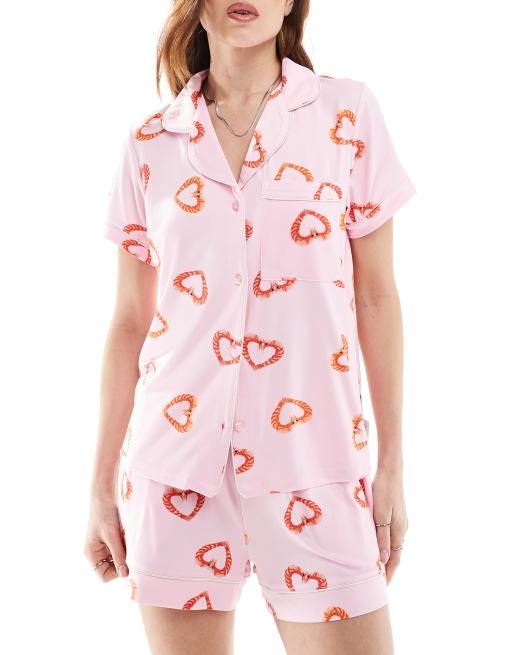Chelsea Peers - Pigiama in poliestere con stampa a cuori con camicia a maniche corte e rever e pantaloncini