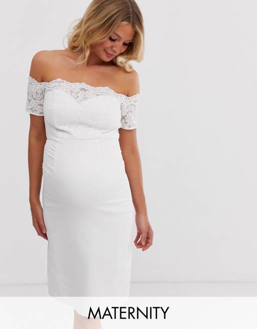 Chi Chi London Maternity - Vestito midi in pizzo all'uncinetto bianco con scollo alla Bardot