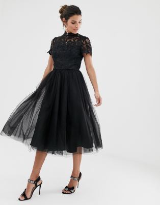 Chi Chi London - Vestito midi accollato in pizzo nero con gonna in tulle