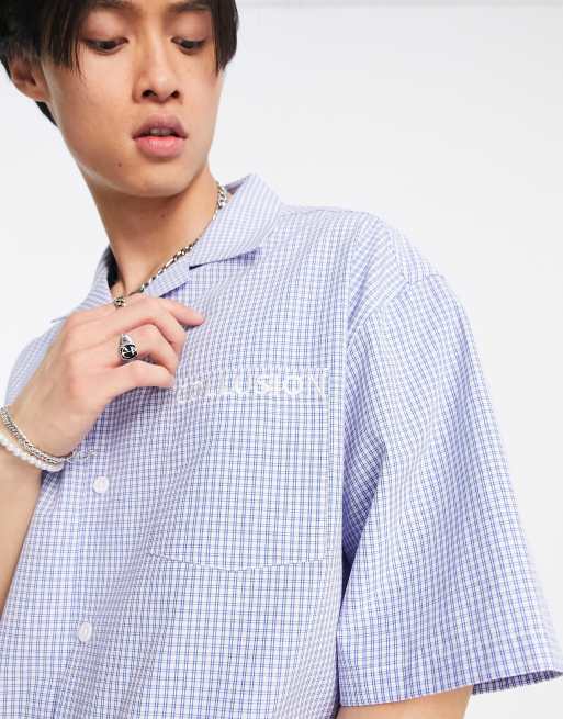 COLLUSION - Camicia a maniche corte blu a quadri con logo