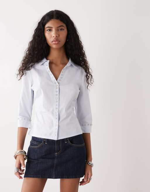 COLLUSION - Camicia aderente blu con bottoni in conchiglia