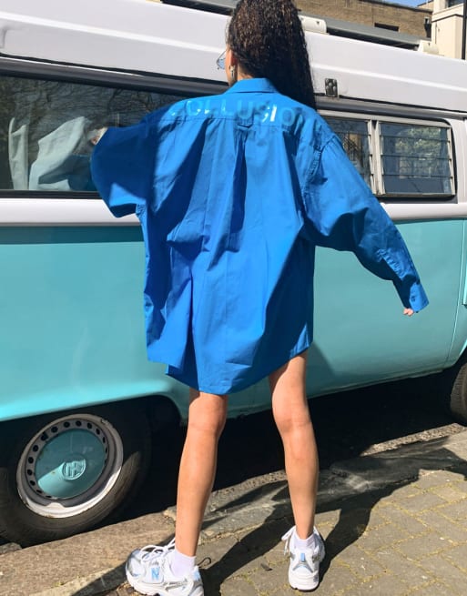 COLLUSION - Coordinato con camicia oversize e pantaloncini in popeline di cotone blu con retro lucido