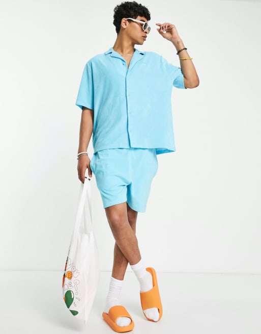 COLLUSION - Coordinato in spugna blu acqua con camicia, pantaloncini e canotta