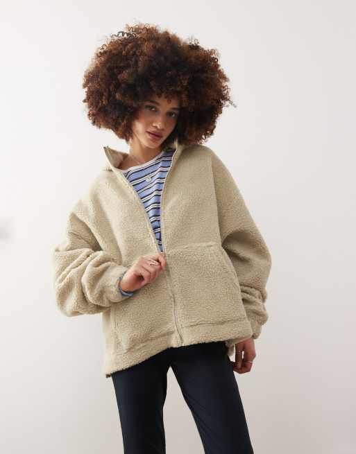 COLLUSION - Felpa in pile borg écru con cappuccio e zip