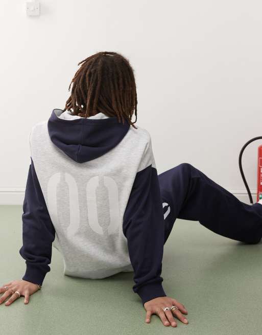 COLLUSION - Felpa squadrata grigio mélange e blu navy con cappuccio e stampa in coordinato