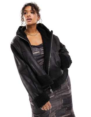 COLLUSION Plus - Giacca stile aviatore in camoscio sintetico nera con finiture in montone