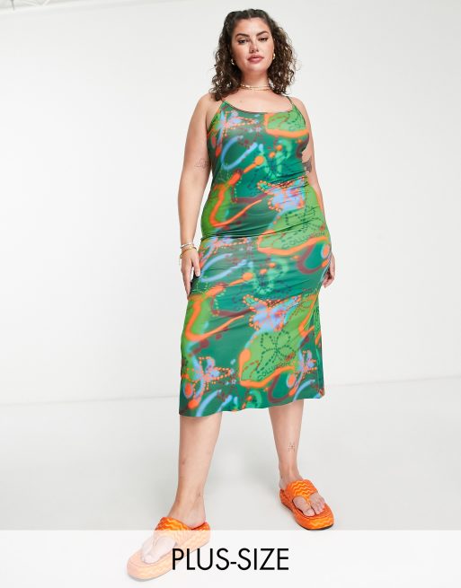 COLLUSION Plus - Vestito midi con spalline sottili verde con stampa di farfalle
