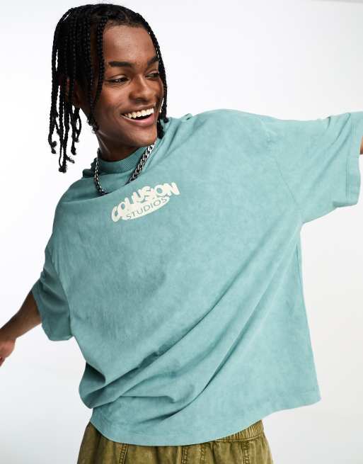COLLUSION - T-shirt blu slavato con logo