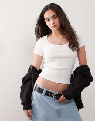 COLLUSION - Top a maniche corte bianco a coste con scollo rotondo