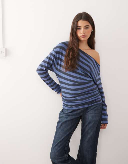 COLLUSION - Top a maniche lunghe blu a righe con spalla scoperta