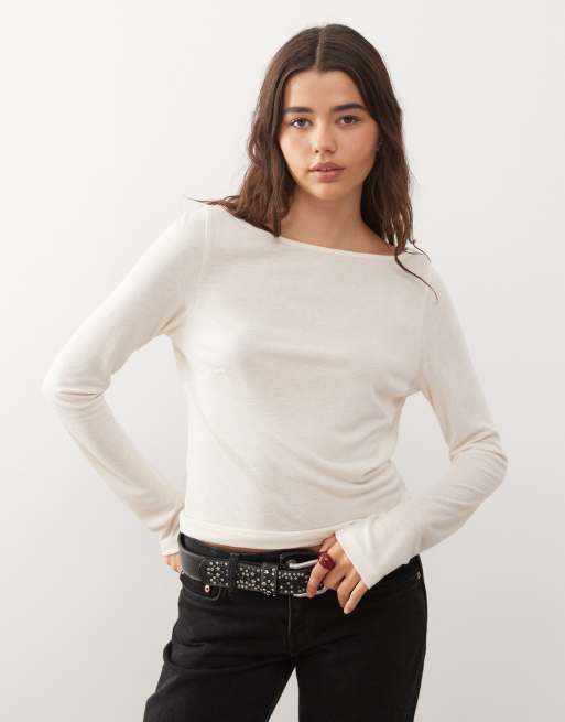 COLLUSION - Top a maniche lunghe testurizzato écru con scollo a barchetta