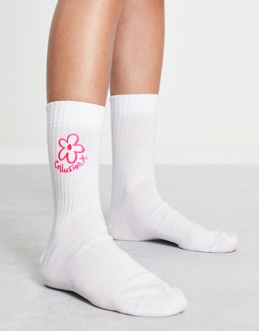 COLLUSION Unisex - Calzini bianchi con logo e fiore