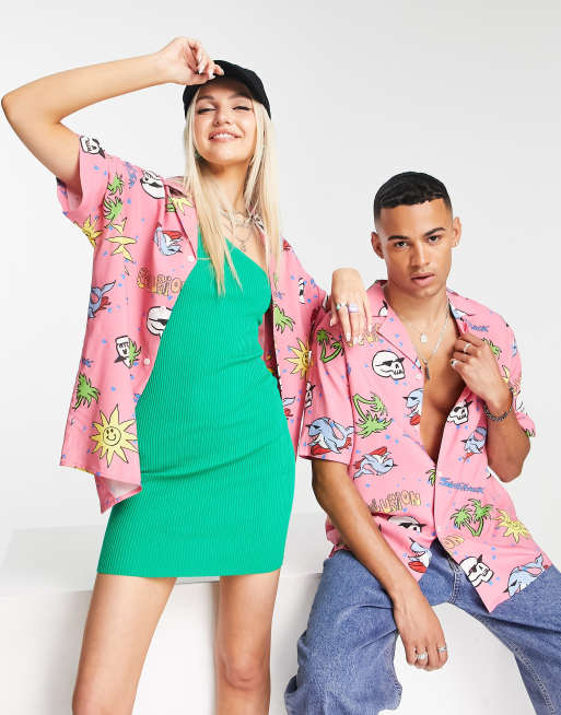 COLLUSION Unisex - Camicia rosa con stampa stile cartoon