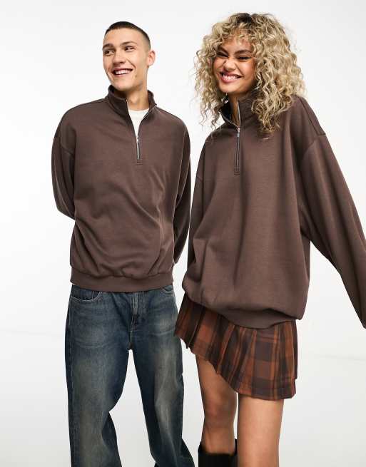 COLLUSION Unisex - Felpa marrone con scollo a imbuto e zip corta