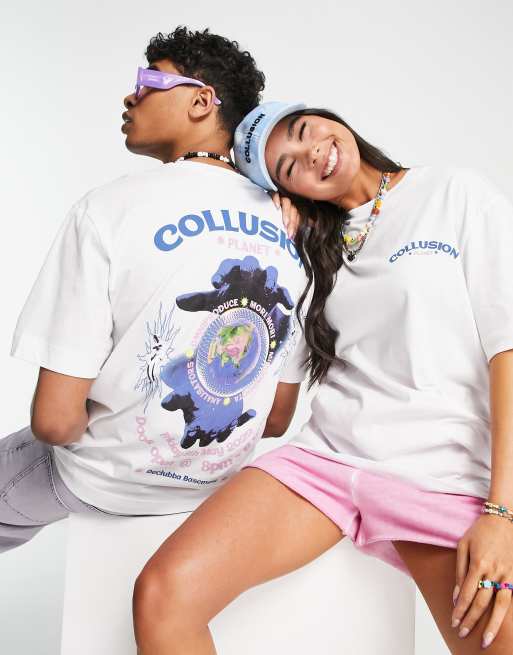 COLLUSION Unisex - T-shirt bianca con stampa di pianeti