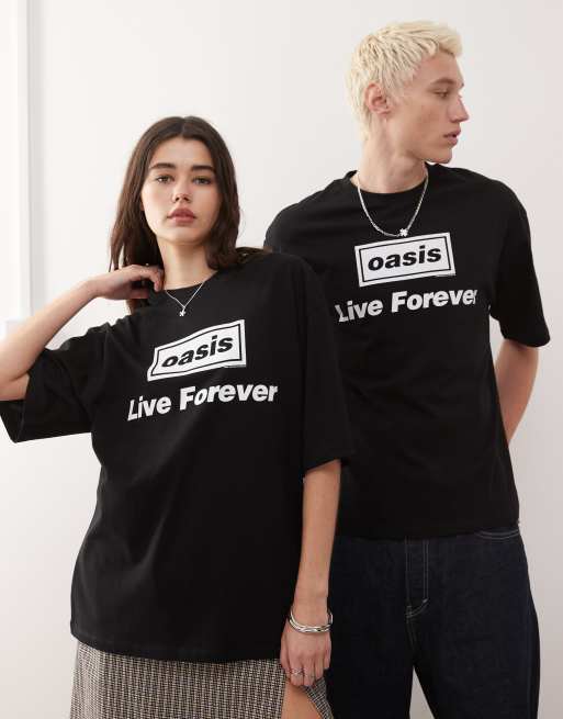 COLLUSION Unisex - T-shirt da festival vestibilità skater nera con stampa ufficiale degli Oasis