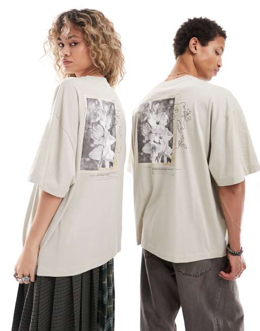 COLLUSION Unisex - T-shirt grigia con stampa fotografica di fiori